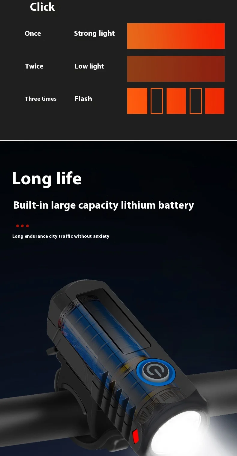 Multi-Level Lighting Modes: One click for high-brightness mode, two clicks for low-brightness mode, and three clicks for strobe mode, catering to different riding scenarios.