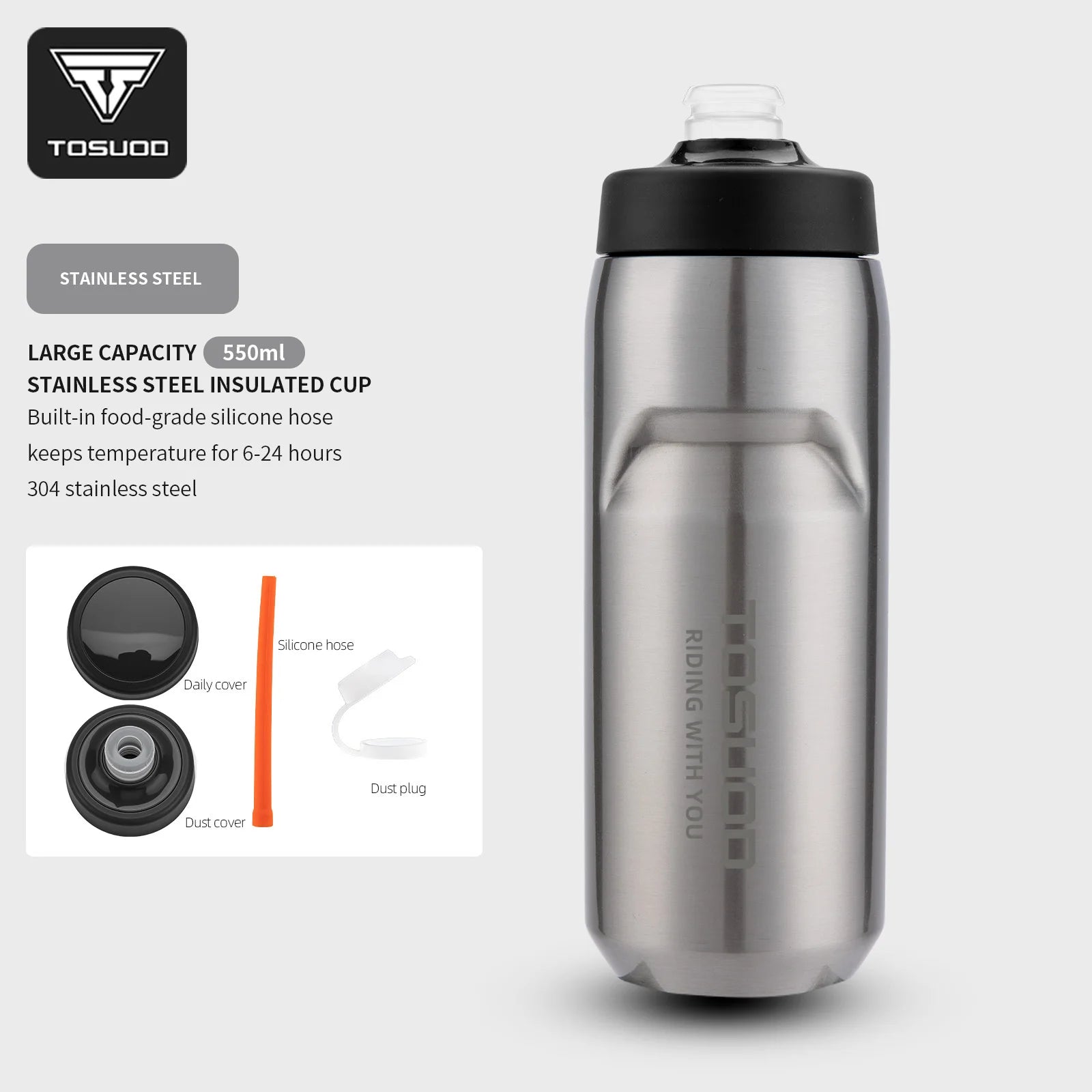 TOSUOD Stainless Steel Insulated Water Cup 550ML 304 Steel Cycling Water Kettle Easy To Carry Keep Warm And Cold Bottle